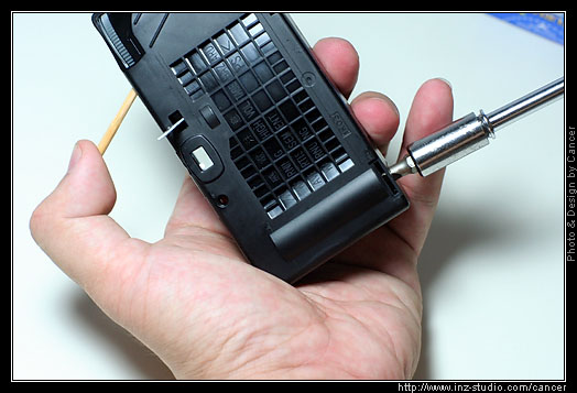等我們殼子裝上後就是要從快門釋放鈕旁的那個孔插入竹籤