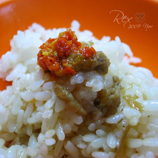 結果...她一閃身端了一個小碗裝了淋有滷醬的飯過來說:「後面有辣醬,配飯很好吃。你試試看。」